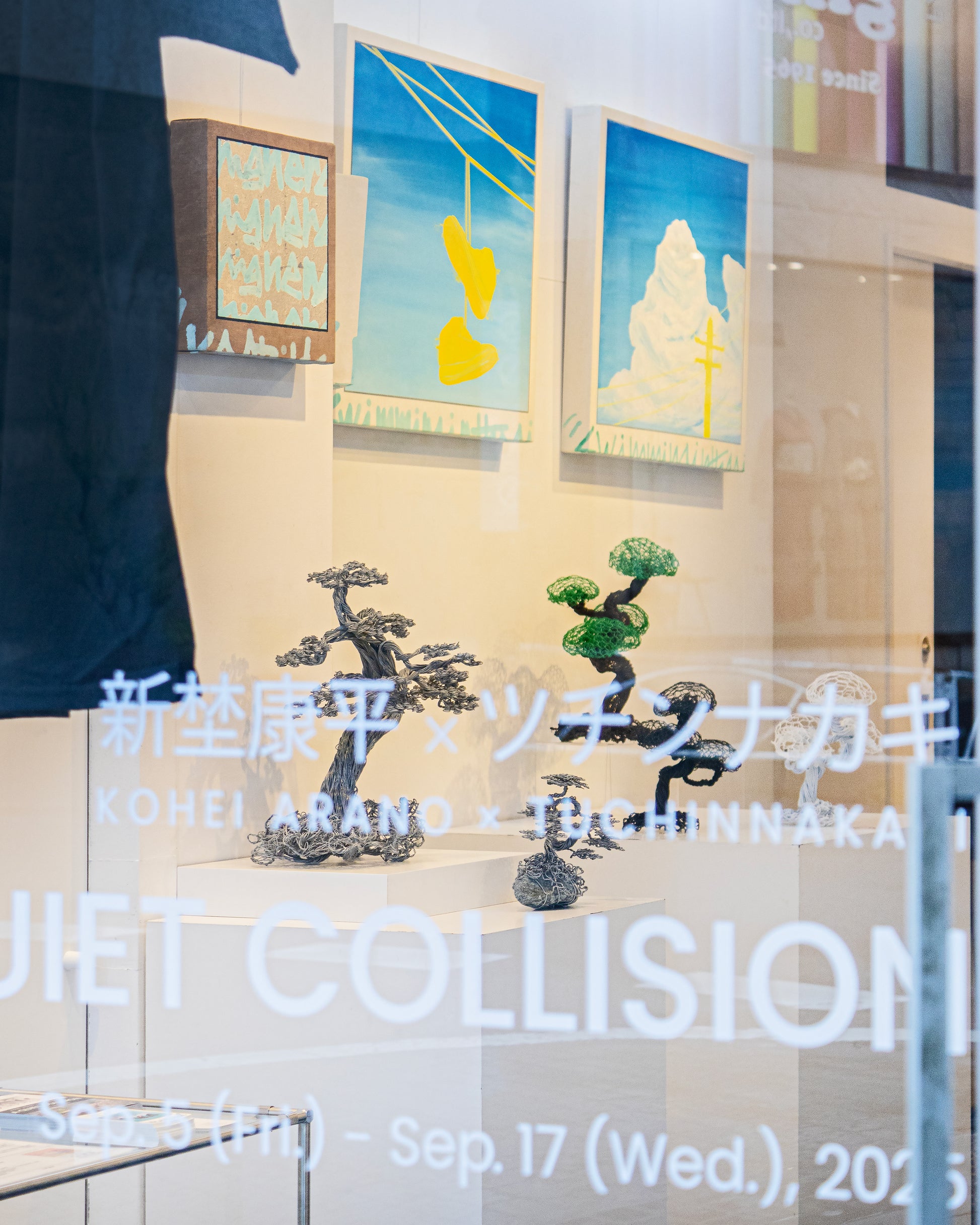 He uses traditional Japanese painting materials such as animal glue, Japanese paper (washi paper), and pigments like gofun as his primary medium. Animal glue, washi paper, gofun, and natural pigments represent classical Japanese painting techniques—traditional artistic expressions passed down through Japan since ancient times. He blends motifs influenced by film and street culture while utilizing the unique properties of these materials, such as their tendency to bleed or drip, creating works that fuse Japanese painting techniques with street culture. Furthermore, by adding thickness to the support to impart a three-dimensional quality, he creates box-like structures that convey an image reminiscent of a cathode-ray tube television.